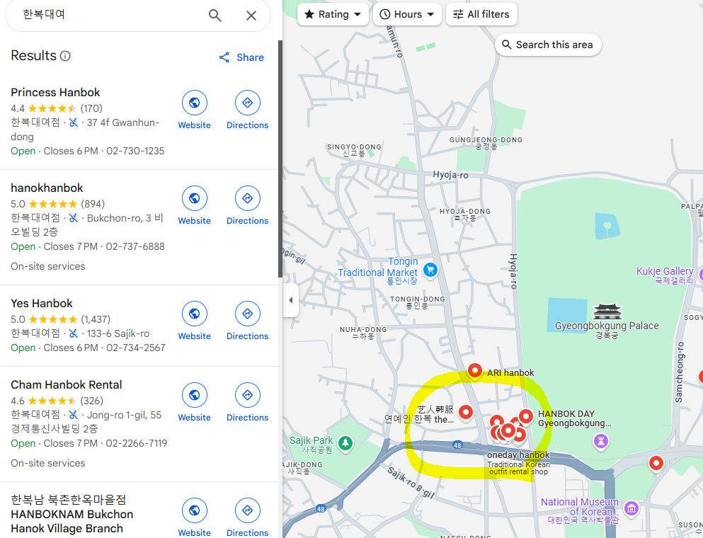 Multiple hanbok rental shops near Samcheong-dong and Tongin Market.